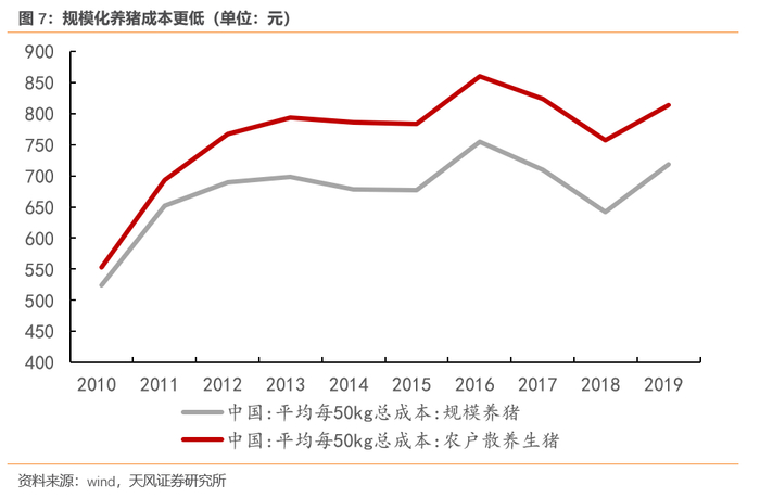 比如生猪的集中化养殖,2023年末生猪养殖的规模水平约为68%,比2017年提升了21%,中等规模的生猪规模化养殖成本比散养低9.8%。