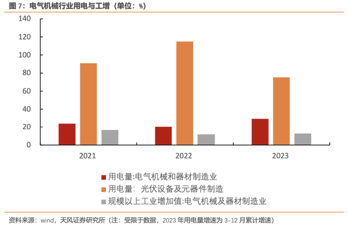 2023年3-12月,光伏设备及元器件制造业的用电量增速为75.2%,同比上年增长150.5亿千瓦时,明显高于电气机械及器材制造业的用电增速29.3%(锂电池制造业未公布用电量数据)。相比于一般产业,光伏制造的耗电量更大,2022年光伏协会测算多晶硅生产的综合电耗为60千瓦时/千克。
