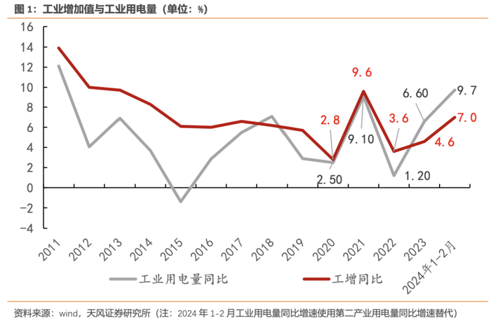 2023年工业增加值增速4.6%,低于工业用电量增速6.6%。2024年1-2月工业增加值增速7%,与第二产业用电量增速9.7%进一步拉开差距(注:统计局只公布了今年1-2月第二产业用电量增速,其与工业用电量增速平均差距小于0.2个百分点)。