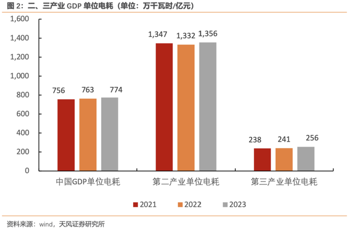 我们用“用电量/增加值”计算“单位GDP电耗”,可以发现2023年第二产业单位GDP电耗从之前的趋势性回落变为了上升,比2022年增加了23.7万千瓦时至1356万千瓦时/亿元,第三产业的单位GDP电耗也比2022年增加了14.9万千瓦时。