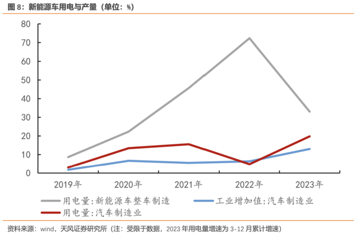 2023年3-12月新能源车制造业的用电量增速为32.9%,也明显高于汽车制造业的用电增速。新能源车的电动化、智能化水平更高,我们认为这或使得新能源车的生产过程单位电耗更高(详见《汽车消费韧性的来源?》2023.12.15)。