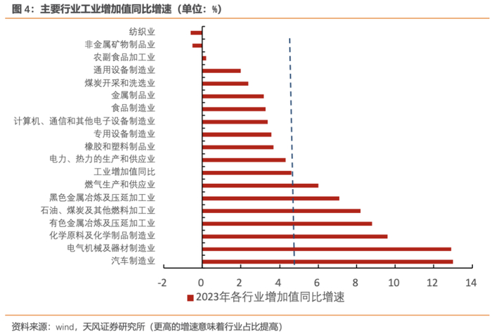 除电力投资外,有色金属制造和黑色金属制造的产出占比提升都有一个共同驱动因素——出口。汽车生产在有色金属的消费中占比7.9%,2023年中国汽车出口同比增长57.8%。2023年中国钢材出口同比增长36.2%,创2017年以来新高。