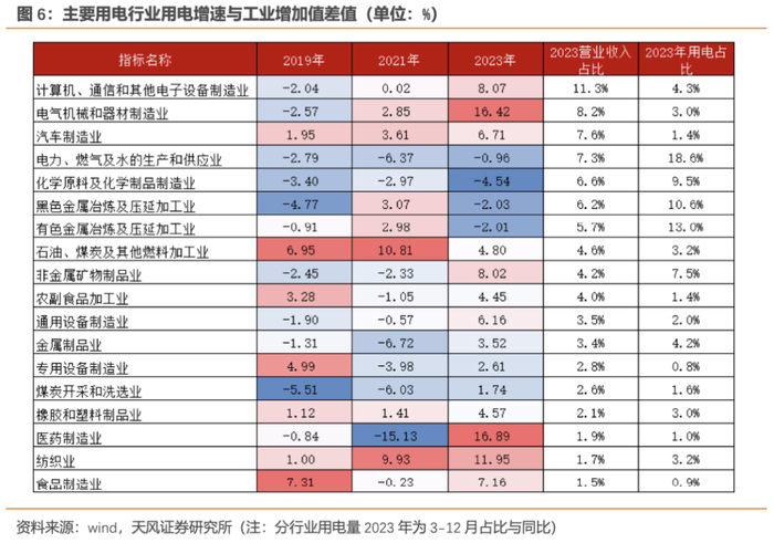 2019年以来,工业用电量增速和工业增加值增速的差值持续上升的行业,主要有计算机通信和电子设备制造业、电气机械和器材制造业、汽车制造业、非金属矿制造业、纺织业。2023年3-12月,以上行业的用电量[2]增速分别高于工业增加值增速8.1、16.4、6.7、8、12个百分点。