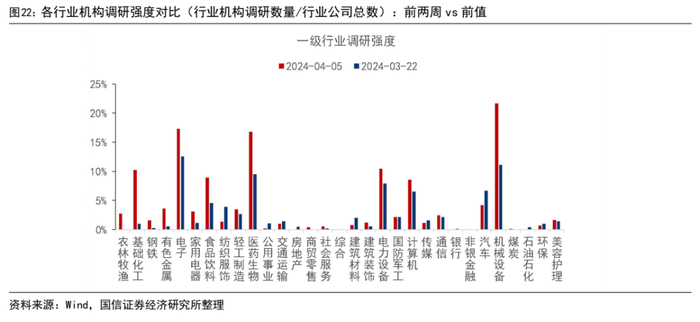 从行业层面的机构调研强度看,机械设备(21.65%)、电子(17.31%)、医药生物(16.83%)三个行业的调研强度最高。