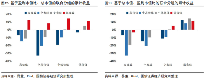 这里进一步考察规模与价值的联合分组的累计收益率。实证结果显示,除高估值分组外,其他价值分组内的规模效应都非常明显,收益率与规模大小呈严格的单调递减关系;高估值分组中也呈现一定的规模效应,高估值微盘股的收益率是最高的,但高估值大盘股的收益率不是最低的。
