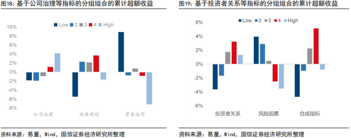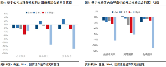 本文回测了易董ESG+8价值评级体系中和G相关的公司治理、公司战略规划、资本运作、投资者关系和风险因素 5 个指标的选股能力。根据回测结果,
