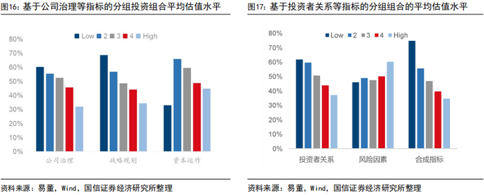 各分组平均估值水平也有类似的特征,基于公司治理、公司战略规划、投资者关系和合成指标的各分组的平均估值水平与指标值负相关;基于资本运作的分组,除指标值最低组外,其他分组的平均估值水平也与指标值负相关;风险因素的各分组的平均估值水平则相差不大,仅指标值最大组的估值水平略高于其他组合。这与相关性分析中的结论是一致的。