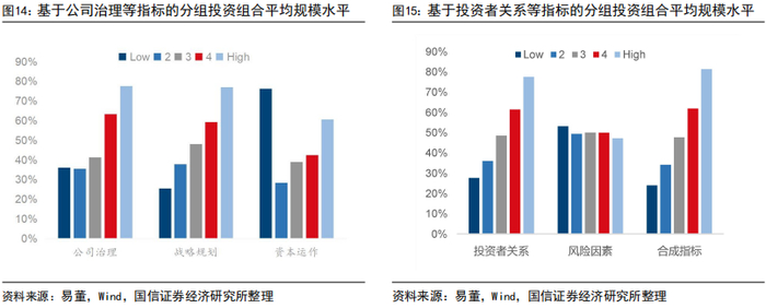 此外,考虑到企业的规模与估值特征,则可使用这些指标进行正面筛选+负面筛选。其中公司治理指标既可以用来正面筛选,又可以用来负面筛选;公司战略规划和投资者关系指标则可以用来负面筛选;而资本运作指标则是一个较好的反向指标,资本运作指标最高(低)的股票的收益率明显低(高)于其规模与估值水平相近的其他股票。