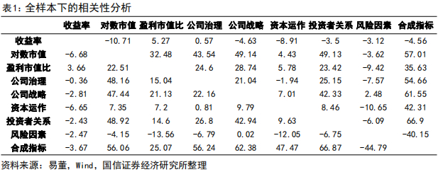 从对数市值、盈利市值比与公司治理等指标的相关性来看:(1)对数市值与盈利市值比正相关,意味着规模越大的股票,估值越低。(2)对数市值、盈利市值比指标与公司治理、公司战略、投资者关系、合成指标的正相关系数相对较大,表明规模越大、估值越低的企业,在公司治理、公司战略、投资者关系方面会做得比较好。(3)对数市值、盈利市值比指标与资本运作指标只有相对较低的正相关,而与风险因素指标也只有相对较低的负相关,表明大小企业之间、高低估值企业之间,其在资本运作、风险因素管理方面的差异不大,大企业和低估值企业在资本运作、风险因素管理方面可能略微更强。