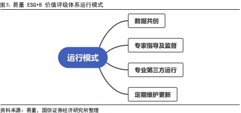 (3)专业第三方运行模式。易董 ESG+8 价值评级体系覆盖全 A 股上市公司,涉及企业和指标众多,数据量庞大,为确保评级体系数据的全面性、准确性以及独立性,价值在线设立了专项计划、独立部门及专业人员实施工作。独立运营团队根据相关规章制度对评级过程进行规范化操作,该团队不参与受评企业的咨询服务业务,亦不向受评企业收取评级费用,最大程度保证独立性;专业人员采用先进的数据算法及模型,全面构建指标数据库,并开展分析评级。