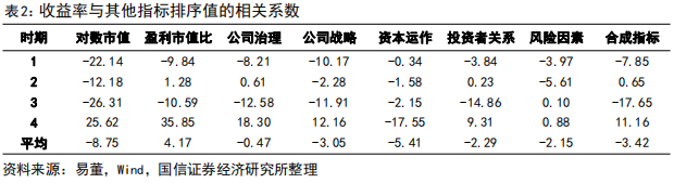 为了进一步考察从未来一期收益率与对数市值、盈利市值比、公司战略等指标的关系,这里进一步计算了各期未来一期收益率与其他指标排序值的相关系数。