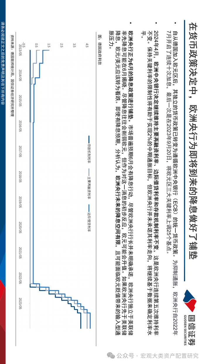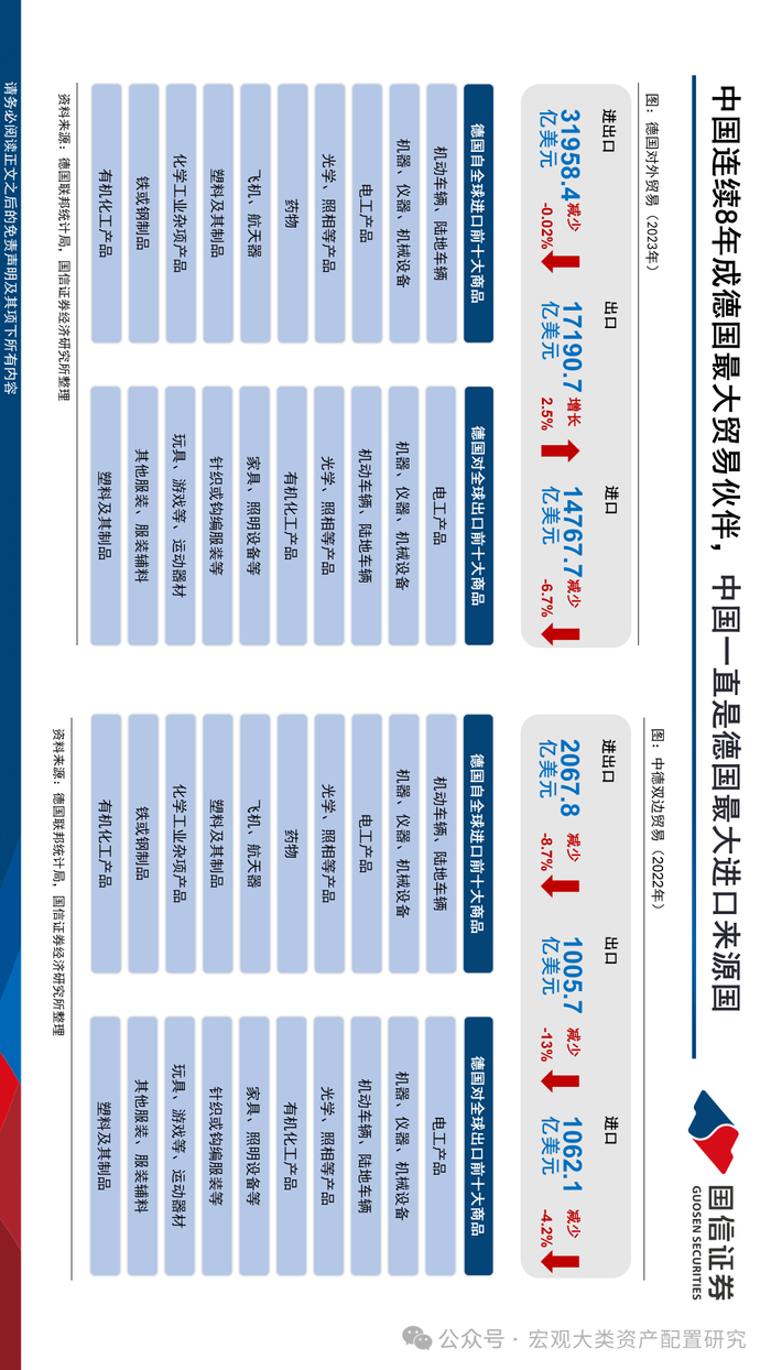 德国经济基本面分析:德国位处欧洲中部,是欧盟人口最多、经济最发达的国家;作为欧洲最大经济体,德国是世界著名高端制造业强国。2023年德国GDP微跌,但超越日本,位列世界第三;分产业看,工业和建筑业增长未能抵消第一产业的下滑。进出口方面,全球需求疲软对德国制造业造成影响,2023年德国出口额下降1.4%;进口额下降9.7%。中国连续8年成德国最大贸易伙伴,是德国最大进口来源国。投资方面,德国2023年外国直接投资大幅增长,国际业务扩张规模提升超过37%;2023年德国对中国的直接投资同比增长4.3%,总额达119亿欧元,创下历史新高。消费方面,德国家庭和政府的最终消费支出都出现下降。人口方面,2023年德国就业人数达到历史新高,新增人口主要系外国劳动力的移民,大多数新工作岗位在服务行业创造,人口少子化得到控制、老龄化难以逆转。政策端,2024年德国将重回“谨慎保守”的财政政策,欧洲央行6月降息预期明确。