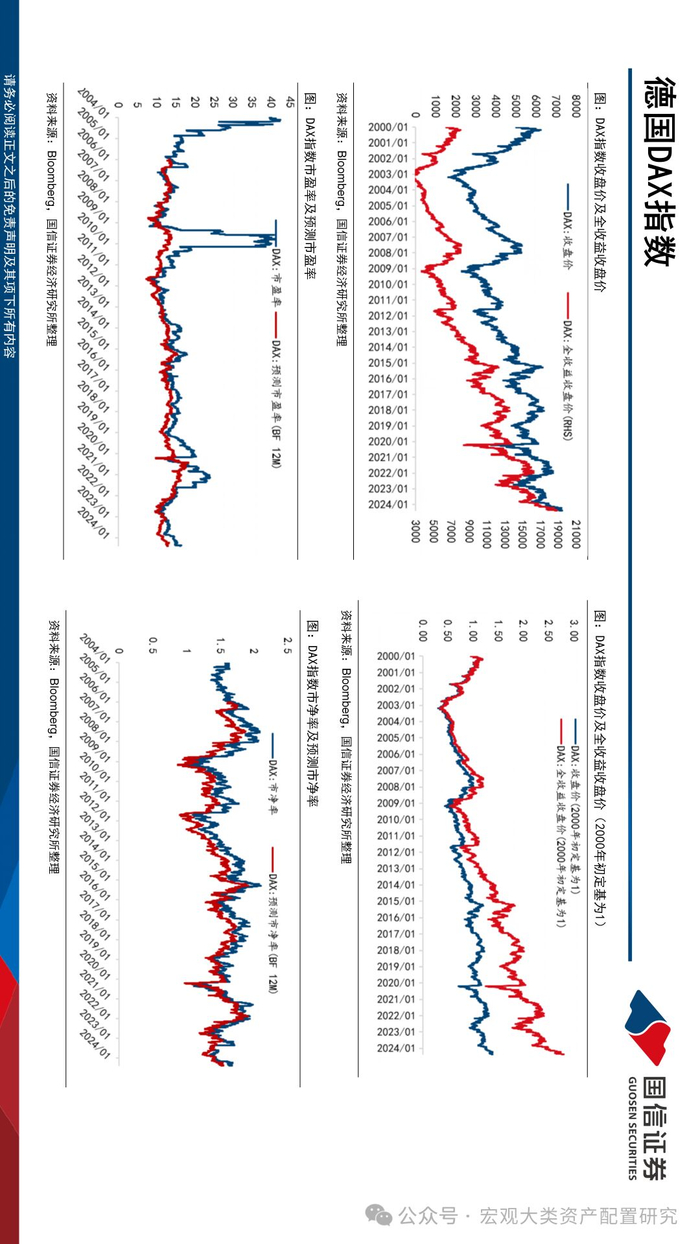 德国权益市场分析:1)德国已经形成了“一主多辅”的证券交易所格局,德意志交易所集团旗下的法兰克福证交所市场份额超过90%,Xetra系统是世界上流通性最高的现货市场全电子化交易平台。法兰克福证券交易所按照监管主体和上市条件可以分为四个上市板块:高级市场、一般市场、初级市场和准入市场。监管上,两个监管主体“平行监管、各有侧重、共同协作”。2)德国DAX指数跟踪在法兰克福证券交易所交易的40支市值最大、流动性高的德国公司,反映德国经济的特征,即以工业为主导,以汽车及配件、化工医药和机械制造等为其支柱产业的经济特征。DAX的收益主要由盈利和分红贡献;盈利和分红贡献了几乎所有正回报,而估值基本贡献了负收益。