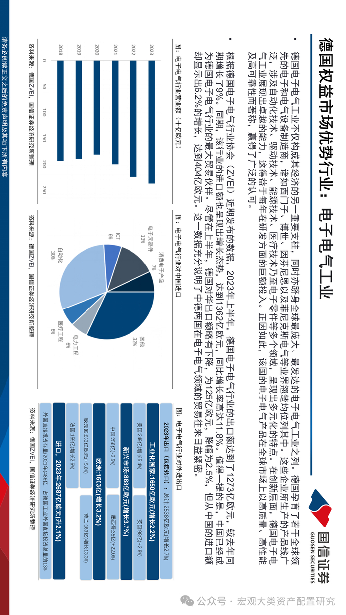 德国权益市场优势行业:德国汽车及汽车配件工业在全球汽车行业中占据显要地位,是全球最大的汽车配件生产国、全球汽车研发的主要投资者之一;德国电子电气产品在全球市场上以高质量、高性能及高可靠性而著称,中德两国在电子电气领域的贸易往来日益紧密;德国机械设备制造业涵盖西门子、博世、曼恩&胡默尔等享誉全球的公司,2023年订单增长了7%;德国的化学与制药业销售额常年位列欧盟第一,代表性企业有拜耳、巴斯夫和亨克;得益于德国政府对可再生能源的坚定扶持以及对环境保护和气候变化议题的深切关注,德国在光伏和风电领域均发展迅猛。