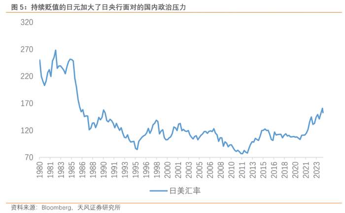于内,是政治压力。日央行需要干预3月以来持续疲软的日元。日央行4月底干预日元贬值的效果并不成功,日元兑美元汇率一度在7月初走高至161.7,创1986年6月以来新低。汇率贬值加大了日央行的政治压力,近期日本自民党众多官员频繁且直接地表达了对于日央行加息的“期待”。