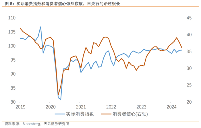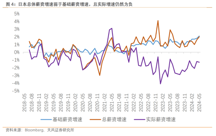 但是日本居民实际薪资增速连续26个月为负,春斗基础薪资增长的背后是其他类别收入增速仍然低迷(奖金、加班工资等)。如果仅依靠基本薪资增速上行带动,日本居民的实际收入增速转正至少还需要一个季度以上。