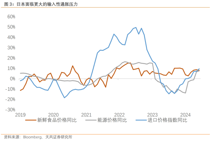 日本物价走高的背后既有内需消费的缓慢修复,也有日元贬值带来的影响。尤其是在近期日元贬值的情况下,日本进口价格同比增速明显回升,带来了输入性通胀压力,这也是日本央行决心加息的动力。