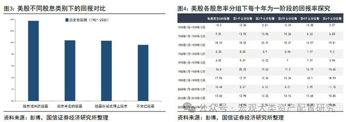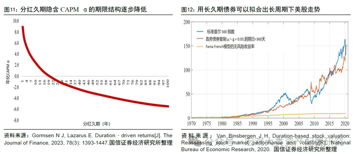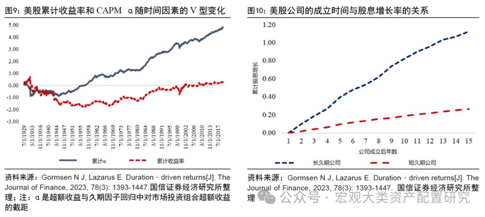 通过上述拐点寻锚可发现,并非是利率或久期在成长价值的辨别上区分度不强,而是因为久期因素在美股风格筛选中应用的时间窗口颇长,要经历漫长的周期淘沙,此前的成长底色的公司随着久期的缩短逐渐展现出价值属性。(1)美股市场近百年经验证实高股息组合无论是累计收益率还是累计α都要经历过V字形的阵痛期,V字形底部偏左侧。如果将根据股票规模和久期将美股分为6个投资组合,组合间的分界点为市值的中位数和久期,取30分位数和70分位数作为两个观测窗口,投资组合权重每月进行依据价值重新调整。那么从1929年开始累计收益率和累计α随时间变化情况,可以看出在统计初期累计收益率和累计α均有所下降,但累计α从1945年前后开始稳步增长,累计收益率也在1970年前后开始进入上升轨道,并于2010年前后扭负为正。通过长/短久期公司的成立时间与股息实际增长率的关系,可以看出成立时间较长,往往也对应发行债券久期较长的公司,在成立后股息实际增长率明显高于久期较短的公司。直觉上周期性现金流较少、未来增长前景较低的公司往往会支付更多股息,股息持续时间较长。(2)美国经验显示20左右的久期值是高股息组合能否跑赢市场基准的关键。随着分红久期的延长,CAPM α也在逐步递减,以20为分界线,久期在20以下时年化CAPM为正、基于股息率设置的投资组合可以跑出超额收益,而一旦突破20则会跑输基准,只不过递减速度边际放缓。换言之,高股息类组合在初步建立时往往还带有久期偏长的成长属性,随着成立时间的延长一方面比传统短久期的公司更容易积攒股息并获得股息增长,随着分红久期的缩短越容易通过价值属性跑出超额,则还是颇为长期的视角,至少以10-20年为一个周期。这一点在日股经验中也有共通验证,国信策略团队在7月10日发布的研究报告《日本股市投资策略进化论》[ 国信策略团队,日本股市投资策略进化论,中提及的“高成长向高分红”板块和标的具有相似规律。
