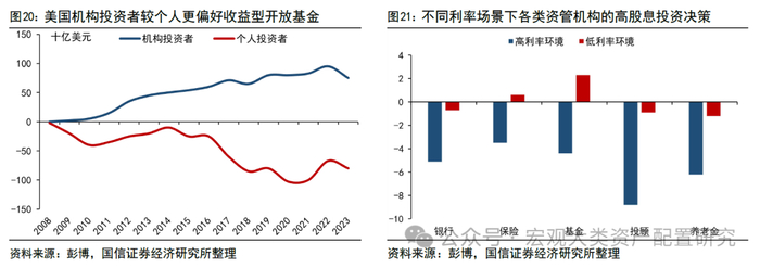 具体来说,共同基金净买入量和机构投资者持股数据体现出“追求股息”的证据:当利率下降时,投资者将更多资金转向以收入目标为导向的共同基金,而收入依赖型机构(如收入型共同基金和保险公司)的投资组合中高股息股票的权重在增加。由此产生的对高股息股票的更高需求似乎增加了其价格对利率变化的敏感性,反而加剧了长期难题。