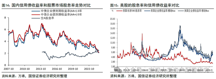 和信用债相比,高股息股票的相对优势体现在资本利得而非票息本身。通过对比中、美两国股票市场的股息率和信用债的到期收益率,我们会发现企业债的收益率常年高于股息率,即信用利差部分弥补了无风险利率的票息覆盖不足。高股息资产和信用债相比在于违约风险相对较低,同时资本利得的回报弹性强于交易盘信用债利率下行带来的回报。从国内市场过去10年的趋势来看,股息率中枢的提升对应着信用债到期收益率中枢的回落,二者有从较大缺口位置逐渐走向汇合,而美国从2000年开始也经历了向下的信用债收益率与向上的股息率间“会师”,却因为新冠疫情带来的冲击导致二者背离越来越大。日本红利股开始受到投资大众普遍关注、新产品密集成立是在95年之后,彼时日本银行大幅降息导致信贷和债券市场利率一度跌破日本股息率,和国内债券市场和高股息股票市场的当下情形有一定相似之处。从国内红利股和信用债的配置盘比较来看,股息率反超信用债到期收益率后,全A股息率较企业债收益率高出30 个bp以上,红利策略配置价值更为突出。