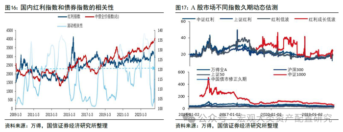 国内股市分市值和风格来看结论和海外一致,即中小成长的久期高于大盘价值。如果按照海外方法拆解不同宽基指数久期,可发现国内红利类指数的久期在18-20附近,而国内债市的修正久期在17附近。全A的久期估测在40附近,按照风格来看,大市值龙头公司的久期明显要低于中小成长公司:中证1000(60.2)>全A(40.7)>沪深300(32.0)>上证50(25.5)。