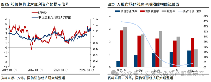 虽然ERP指标对A股大势研判的提示效果逐步失效,但对红利资产相对收益的择时依然有效。基于红利资产的估值倒数和十债收益率测算的股债性价比,方向的变化对红利资产择时依然有很强的借鉴意义。如2019-2021的红利ERP下行和2021年以来的红利ERP上行,“看股作债”思路对类固收属性的红利类资产相对全A跑输和相对占优的提示效果都较为精准。