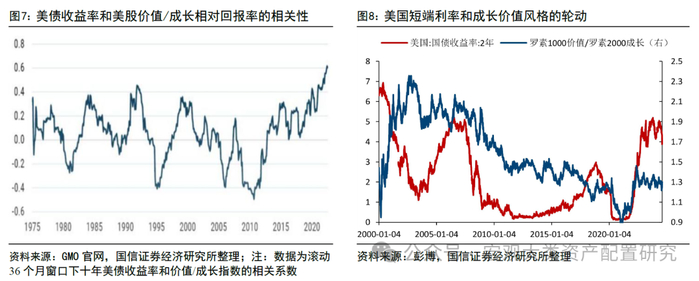 股票市场中涉及久期问题最常见的风格即成长和价值,如果将两大风格作为久期跷跷板两端,则中间的支点即利率走势。而实质上利率只是触发久期对风格切换的因素之一。传统市场观点认为价值股的久期较短、成长股久期偏长,其实和DDM或者DCF模型透过未来长期现金流或者股息回报折现的思路异曲同工。更高的利率会导致成长型公司陷入困境,因其大部分短期内盈利能力有限而前景被看好,但是其产生的未来现金流会以更高的利率来贴现,使其股票价值下降。低利率环境适用于成长股、高利率环境有利于价值股,但这一前提是没有新的重大技术进步、分子端是稳定的。在过去2年多加息周期中美股“七巨头”作为典型的成长标的依然可以凭借人工智能的技术突破而不断突围,分子端的逻辑明显超越了分母端的逻辑,市场对未来技术落地后市场空间和盈利前景的畅想持续碾压了资金成本对估值的冲击。Inker B(2021)通过实证方式证明了虽然美股中价值股久期略短于全市场中枢,成长股久期略长于市场中枢,但二者间差异并没有想象中的大,很容易被收入等其他因素所吞噬。如2018-2021年初的三年多时间里十年期美债收益率月度变化与罗素1000价值股相对成长股超额回报率间相关性仅为0.28;拉长时间来看相关性则更低,1983-2021年初相关性在-0.003左右,利率因素相较其他基本面因素对成长/价值风格再平衡而言甚至显得无足轻重。从过往数据来看在2年期短债利率走强时市场的确更加偏向价值风格,适合于找绝对拐点(如2004、2021年的低点和2008年的高点)但规律阶段性也会失真,如2010-2015年之间短债利率斡旋不动的情况下,大盘价值相对小盘成长仍然有较大回撤,而在2015-2018年间短端流动性收紧时,价值股相对成长股却出现了显著跌幅。