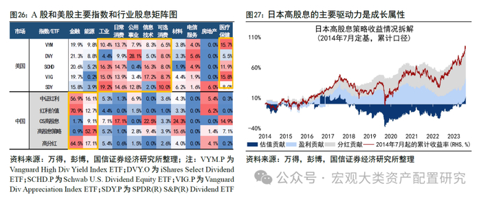 低利率环境下通过久期腾挪的方式进行高股息行业再平衡,于A股市场收效有限,但是适用于海外市场。从国内资产对比来看,债券的久期则更取决于各行业融资的属性,与产业周期关联并不紧密,也不太符合估值模型的定价范式。A股的“高股息+长久期之谜”并不突出可能与经济与市场发展转型阶段有关,当前市场还处在从初创成长走向成熟落地的路径途中,很多成长性行业并未完成美日经验规律中价值分红型的蜕变;也佐证了DCF、DDM模型在短期内还有应用空间,只不过市场情绪很难在事前估计,而从事后验证来看情绪因素对市场贡献甚至超过分子端盈利和分母端流动性的总和。借用债券思维,在利率较低的情形下债券类资产通过拉长久期的方式增厚收益;而在A股票市场中,一旦高股息策略随着股价涨、股息率摊薄的悖论逐渐失去性价比,那么在国内的高股息期限结构下,通过拉长久期的方式去配置成长型红利并没有收效。如上文图15所示,成长性红利指数的久期常年高于红利指数和红利低波等指数,对应股息率也有所打折。但在美国和日本市场中,这类盈利所支撑的成长性却是红利类资产常年跑赢的重要原因。相比A股高股息品种呈现在传统型价值行业,美股更多出现在成长型新兴行业。这点很好诠释了美国市场的“高股息+长久期之谜”。