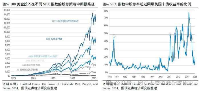 美股市场虽然不乏高成长的标的,高股息策略依然是长期制胜手段。(1)高分红的胜率优势:按照1930-2023年间股票的分红次数将美股分成五个梯队,则分红次数从高到低五组的个股常年跑赢SPX指数的概率依次为70%、70%、60%、50%、40%。(2)红利再投资的复利价值:如果在1960年投入初始的1万美元,则在2023年末按照SPX指数的价格变动可以获得80万美元,但如果考虑股息再投资则可以获得512万美元,二者间回报率相差数倍,体现出分红和复利功劳。