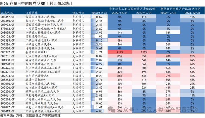 以期末货币衍生工具余额占基金资产净值的比例及期末外汇合约市值占外汇敞口的比例考虑各产品锁汇策略,存量25只QDII债基中(包含暂停申购的),采取灵活锁汇策略的有16只,偏向于不锁汇的有9只。锁汇比例较大的债券型QDII可以大幅对冲人民币升值的汇兑损失以降低汇率风险,当前锁汇成本在2-4%区间,可选择更具备弹性的偏长久期债基以资本利得弥补这部分成本对收益的侵蚀。值得注意的是基金产品的锁汇与否基本依据于基金合同中的表述来判断,实际锁汇情况需要结合现成调研等获取更为准确的信息。
