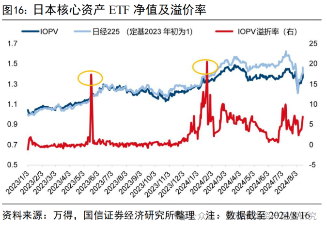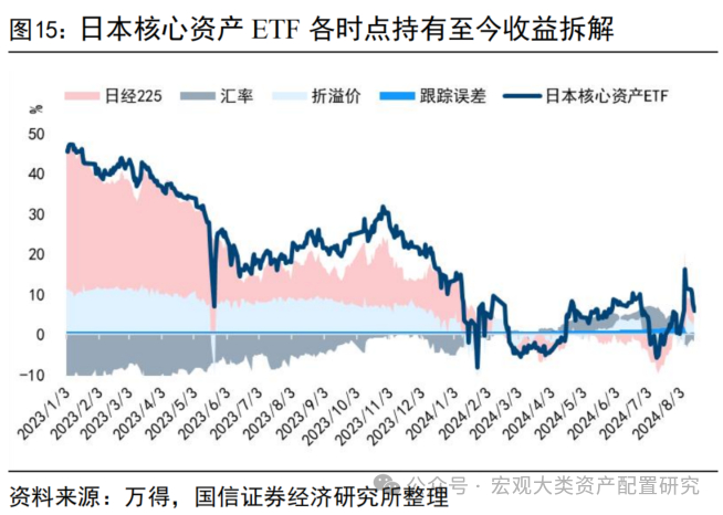 溢价率过高或透支底层资产的涨幅,但折价产品往往存在某些“硬伤”,且极高溢价一般不可持续,因此应当选择在溢价合理的时点,避开情绪高涨的顶峰进行择时。日经225指数自2023年初经历一年半的上涨周期,尽管7月12日以来大幅回落,从长期持有的角度来看,在2023年布局的涨幅依然客观。华夏野村日本核心资产ETF在2023年全年溢价率保持0.7%左右,2024年初受日本股市近一年的牛市行情和资产荒影响,场内多只日本核心资产ETF走高,推动相关产品溢价率飙升,后虽有所回落,但溢价率中枢整体上移。因此,在2023年全年区间布局代表性产品,都能收到来自折溢价的正收益,而在2024Q1的溢价高峰段布局则会因买入时点溢价率过高而对收益形成拖拽。