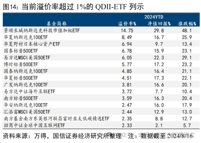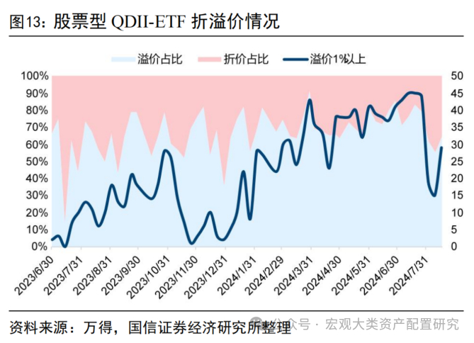 供求关系影响下,场内场外两种定价方式结果不同,即产生ETF的折溢价。ETF既可以直接在一级市场申赎,也可以在二级市场场内交易,这就涉及两种不同的定价方式,一级市场的ETF定价根据基金参考净值(IOPV)确定,而二级市场交易现价受供求关系影响,当ETF的二级市场价格高于一级市场价格时,即产生了溢价。若场外QDII基金由于额度等因素限制申赎,或市场情绪高涨,则会推动投资者场内布局该产品从而推高场内溢价。自2023年末以来,海外发达市场表现较好,跨境ETF备受投资者青睐,叠加额度有限等因素,不断推高场内溢价,溢价率在1%以上的股票型QDII-ETF最高达45只。8月,受美国经济数据走弱、美国上市公司业绩低于调查值、日本货币周期转向等因素作用,全球股市经历较大回撤,一方面是海外市场热度回落,另一方面是部分产品额度放宽,部分高溢价产品的溢价率大幅回落,此时布局股票型QDII-ETF性价比或更高。当前,溢价率较高产品有4只标普500ETF、3只纳斯达克100ETF、2只明晟美国50ETF,此前热度较高的纳斯达克科技市值加权、日经225等也保持着较高的溢价率。