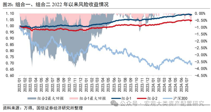 从实践效果来看,虽然互认基金可以打破额度约束限制,但是中资美债的持仓拖累近年的组合业绩。我们用两个组合加以模拟:组合1按照不同比例配置美元债QDII基金、纳指ETF、国内短债基金、国内主动债券基金,其中国内债基占比最高,海外权益类产品仅做小比例增厚收益使用;组合2将美元债基金置换为互认基金,其余配置比例保持不变。对比组合1和组合2 2022年1月4日至2024年7月31日的风险收益特征,组合1的年化回报3.5%,2022年初以来最大回撤为2.19%、近一年最大回撤1.02%;组合2年化回报为1.8%,2022年初以来最大回撤为3.92%、近一年最大回撤1.32%。将中短期美元债QDII产品替换为互认基金,年化回报与最大回撤均效果均不理想,产品风险敞口过于集中,是受到过去几年中资美债持仓的业绩拖累所致。