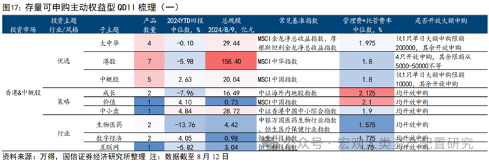 投资标的上,港股&中概股主导。根据2024年一季报披露情况,对存量可申购主动权益型产品实际投资区域进行穿透,投资规模最大的五个国家和地区分别为H股市场(229.86亿元)、美股市场(203.82亿元)、A股市场(88.36亿元)、越南股票市场(65.02亿元)、印度股票市场(12.49亿元)。