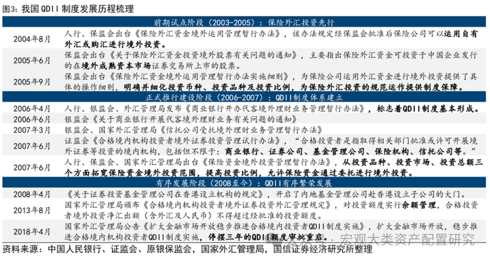 随着我国资本市场对外开放的提升,QDII制度经历前期试点、正式推行,迈入有序发展的新阶段,为境内投资者提供了便利的海外布局渠道,实现全球化资产配置和风险分散。伴随着我国正式浮动汇率管理制度的正式实施,以保险外汇资金为起点,QDII制度迈入前期试点的筹备阶段;2006年《商业银行代客境外理财业务管理暂行办法》的发布,标志着我国QDII制度的正式形成。现行法规体系下,证券类QDII(券商和基金)、银行类QDII、信托类QDII、保险类QDII全面发展。