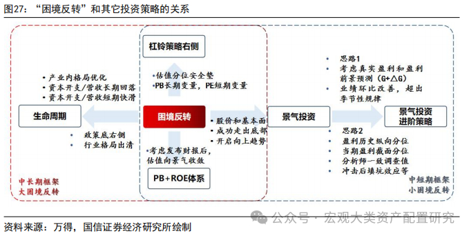 在大困境反转的中长期框架和小困境反转的中短期框架叠加下,从困境反转角度加上估值分位、PB、PE等因素的考虑即为杠铃策略右侧;考虑发布财报后,估值向景气收敛即为PB+ROE体系。