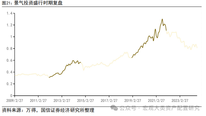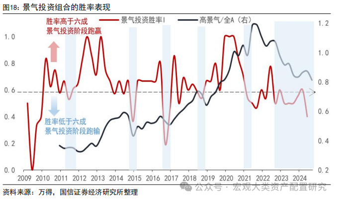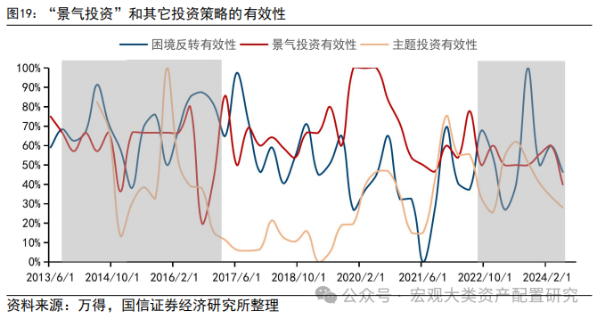 景气投资在大部分时间跑赢其他策略,但在特定语境下也会被困境反转和主题投资反超。景气投资筛选业绩增速较好的行业和公司,困境反转则关注经营不利出现亏损公司的反转境遇。整体来看,两者走势呈现互补态势,但在经济走弱或复苏阶段末端的转型期,两者或呈现同步。历史上,景气投资策略在阶段末期往往跑输其他策略,如2014年景气投资向核心资产切换过程中,景气投资因前期上涨较多出现回撤,市场从困境反转博弈至核心资产,主题投资也出现了阶段性的牛市,景气投资明显跑输其他策略;2021年底新一轮景气投资受到经济面和政策面的冲击,有效性相较2019、2020年下降较多,困境反转和主题投资接续,景气投资有效性持续走弱。