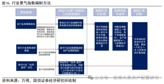 如何追踪中观行业景气度?运用各行业高频数据,以扩散指数编制方式可以建立追踪中观行业景气度的有效指标。扩散指数法是一种常用的经济预测方法,可以通过考察多个领先经济指标的升降变化来判断未来的经济景气情况,其优点在于能够综合考察多个经济指标,而不是仅仅依赖单一的领先指标作出预测,这有助于避免因某些特定指标的异常波动而导致的错误预测。具体的编制方法如下: