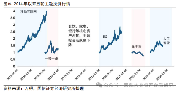 复盘主题投资兴衰史,可以发现热门主题投资受经济周期、产业基本面和利率环境的共同影响。2014年以来A股共经历五轮主要的新兴主题投资行情,分别为2013-2015的移动互联网、2015年的一带一路、2019-2020的5G、2021年底的元宇宙、2023年以来的AI。一方面,在超额流动性充裕+风险偏好抬升区间,主题投资一般会成为市场主线;另一方面,产业端的重大创新或政策利好催化该产业成为区间内活跃主题;而主题投资的结束也来自流动性的收紧和政策趋紧、业绩承压等产业内部的冲击。