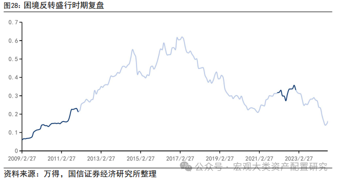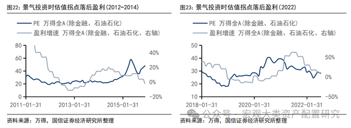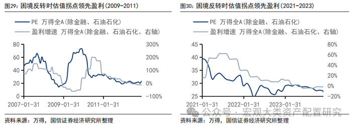就困境反转而言,“戴维斯双杀”下估值领先于盈利的持续反弹是主要特征。在企业盈利的下行周期,困境反转通过博弈“市场底”达到左侧布局、赚取超额收益的目的。此时,出于资金行为的股价上涨背离了盈利下行的基本面,主要体现为估值的强力反弹。困境反转行情的持续取决于“市场底”是否出现,历史上,第一轮困境反转行情(2009-2011)出现了盈利的强力反弹,“戴维斯双杀”过度至“戴维斯双击”,困境反转逻辑演变为后续的景气投资;而在第二轮困境反转(2022)中,股市反弹后“盈利底”迟迟未出现,困境反转行情短暂出现后迅速下行,困境反转得到证伪。