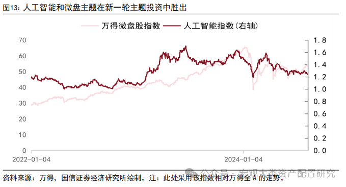 在本轮主题投资之中,人工智能和微盘股韧性较强。主题投资的特征之一在于主题切换速度快,资金流动的规律性较弱,基本面逻辑暂时失效。如人工智能指数在2023年H1起换手和成交放量,资金博弈充分,先估值主导后业绩主导,在新一轮主题投资中韧性较强。