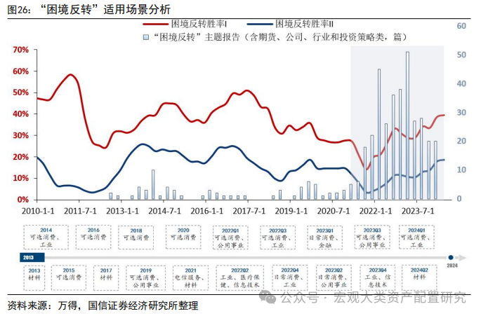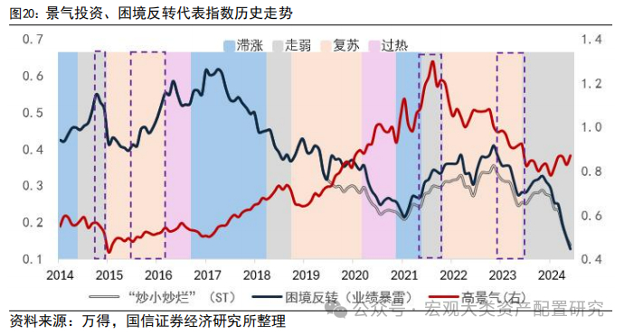 理论上,景气投资与困境反转策略走势相悖:景气投资筛选业绩增速较好的行业和公司,困境反转则关注经营不力出现亏损公司的反转境遇;整体来看,两者走势呈现互补态势,但在经济走弱或复苏阶段末端的转型期,两者或呈现同步,如2014年底、2015下半年-2016年初、2021Q3和2023上半年。