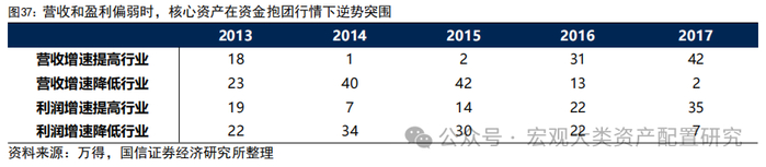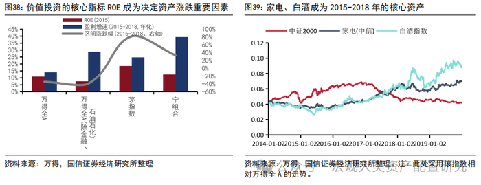 在核心资产投资时期,盈利增速难以主导资金偏好,市场更为关注高ROE品种。以2015-2018年间盛行的茅指数、宁组合和万得全A对比,我们发现期初ROE较高的资产,在本轮投资中涨幅较高,如茅指数同时具备了高ROE和低盈利改善的特征,但其区间涨幅较高,并未跟随盈利增速下修的逻辑。