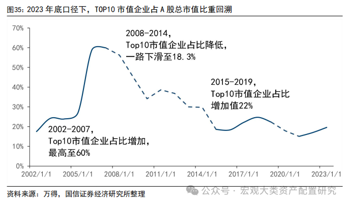 强者恒强的逻辑下,头部公司集中度跃升和核心资产行情,在资金驱动下互为一体两面。我们通过观测A股中前十大公司的市值占比来度量整个A股的集中度,可发现统一按照当年年初的市值口径观测,从拐点看自2008年以来龙头集中度都在下滑,和我们观测的HHI指标反馈的市场化、竞争化方向一致。而在2015-2018年核心资产明显跑赢的年份,前十大公司的市值集中度阶段性回升,也验证了市值集中化和资金流动相互吸引的逻辑。