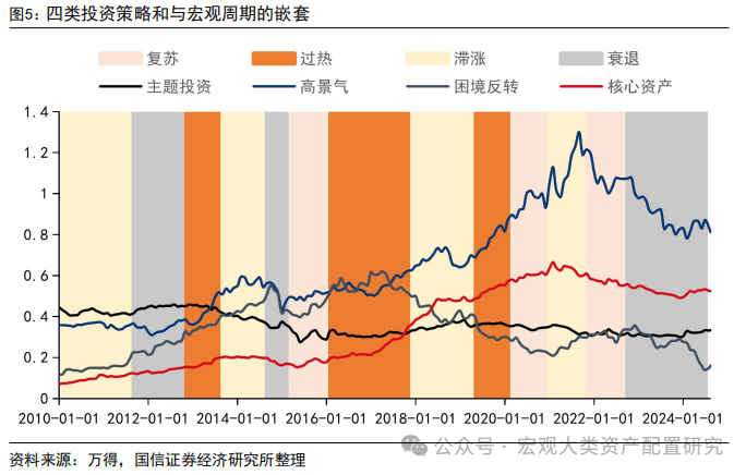 以主题基金指数(市场上代表性的主题类基金产品净值)、高景气指数(高ROE、高盈利增速)、困顿标的(ST、业绩暴雷等)和大盘龙头(沪深300、茅指数)分别作为主题投资、景气投资、困境反转和核心资产的走势参考,我们发现不同投资场景有其宏观定价逻辑。主题投资在经济承压阶段表现最好,这是因为基本面承压时市场往往缺乏明确主线,行业从承压向复苏的逻辑共识度较低,此时,“热度”和“广度”俱佳的主题受到投资者热捧。景气投资在滞涨和过热期间表现较好,这是因为滞涨和过热期间通胀往往上行,涨价逻辑下高需求成为行业景气度的抓手,景气上行成为自上而下甄别优质资产的有效方式。困境反转在滞涨期间表现较好,因为滞涨期面临经济下行和通胀上行的双重拐点,困境反转成为左侧布局的有效策略;核心资产在每个周期均能获得不错的收益,在经济过热期间更强。核心资产以大市值龙头为标签,自身盈利性较好,具备跨越周期的能力,且经济过热期间伴随着投资过热和资金宽松,核心资产更易获得超额收益。