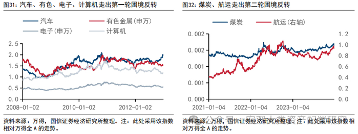 困境反转行情中,高赔率成为资金博弈的主要目的。困境反转下,资金会通过寻找超跌品种来博弈基本面向上的弹性,提前布局获取高额收益。为了兼顾胜率,资金会寻求存在政策空间和事件驱动的资产,比如,在2009-2011年间,汽车下乡、周期共振下的有色金属、苹果果链引领下的电子、计算机成为资产博弈的重点,跟踪相对万得全A的走势,这些行业在本轮困境反转中表现较好。2022年,市场在周期下行中缩量严重,煤炭、航运受周期和政策影响较大,在年中的政策密集发布期,资金开始博弈前期超跌品种,煤炭、航运走出困境反转的行情。