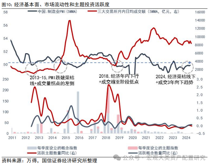 在经济承压(PMI跌入荣枯线以下)的弱基本面环境下,流动性欠配转向流动性扩张,主题投资相较其他投资范式更为适配。如2013-2015年PMI跌破荣枯线,成交额处在拐点左侧,宏观环境处在弱复苏或下行期;2018年经济年内下行、成交溃缩至阶段低;今年PMI处在荣枯线下,市场成交额连续第三年处于下行趋势中。从概念指数和主题指数的设立与活跃情况来看,可以验证上述时间节点处在与指数活跃度同比高增节点一致。