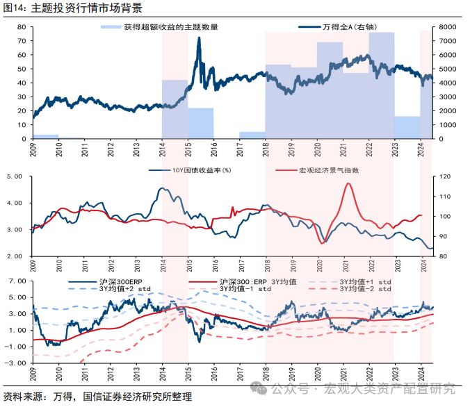 在宏观经济复苏节奏放缓,外部不确定性加剧的市场环境下,传统的价值投资及景气投资策略缺乏施展空间。相对而言,“主题投资”策略却以其独特的优势,能够适应市场的波动性和不确定性,还能够更好地把握宏观经济和政策导向带来的投资机会。主题投资策略的收益主要来源为目标资产估值的增长。因此,在有利于相关资产估值提升的市场环境中,采取主题投资策略的相对优势更为显著。即主题投资适用于市场缺乏分子端显著占优的投资机会、宏观流动性较为宽松、市场风险偏好较高的情形。
