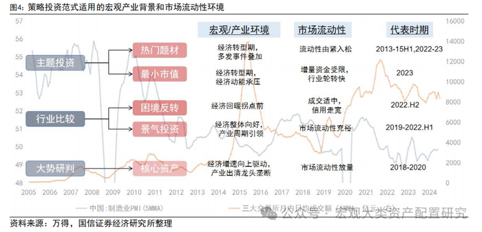 策略投资范式在历史上存在主线切换,市场历史上常经历“大势研判-行业比较-主题投资”的三位一体更迭。2005年以来,市场经历过约三轮投资主线的周期更迭,大势研判始于慢牛行情起点,宏观经济景气度回升期间,此时基于经济周期规律、经济数据、盈利指标如ROE等进行推演和预判有效;行业比较有效区间与股债风险溢价下行、宏观经济景气度回落并行,市场风格偏成长,此时根据行业维度进行遴选,寻优景气赛道的效果较好。主题投资多发生在基本面磨底后期,市场缺乏明确的趋势性行情,对新主题的刺激较为敏感,此时根据主题的热门程度进行左侧挖掘或右侧跟随都比较奏效。从大势研判到行业比较,再到主题投资,宏-中-微观的策略范式相比并列的体系,更贴近交替轮动的使用场景。