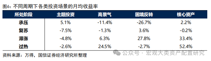 不同投资场景有其宏观定价逻辑。主题投资在基本面承压阶段表现较好,这是因为承压时市场往往缺乏明确主线,行业从承压向复苏的逻辑共识度较低。景气投资在滞涨和过热期间表现较好,涨价逻辑下高需求成为行业景气度的抓手,景气上行成为自上而下甄别优质资产的有效方式。困境反转在滞涨期间表现较好,面临经济下行和通胀上行的双重拐点,布局困境反转成为左侧布局的有效策略;核心资产在每个周期均能获得不错的收益,在经济过热期间伴随着投资过热和资金宽松,核心资产更易获得超额收益。